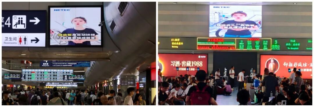 北京西站作為亞洲規(guī)模領(lǐng)先、客流量密集的現(xiàn)代化鐵路樞紐,每日承擔(dān)數(shù)十萬旅客的出行服務(wù)。車站方深知提升旅客安全乘梯意識的重要性,在自媒體平臺看到上述科普視頻后,主動聯(lián)系NETEC并提出轉(zhuǎn)播申請。經(jīng)友好溝通,NETEC 同意北京西站在其候車大廳核心區(qū)域的電子顯示屏上,全天候高頻次滾動播放該視頻。